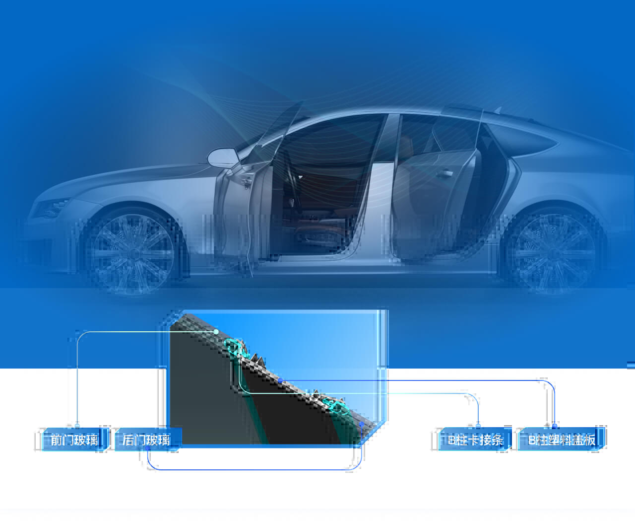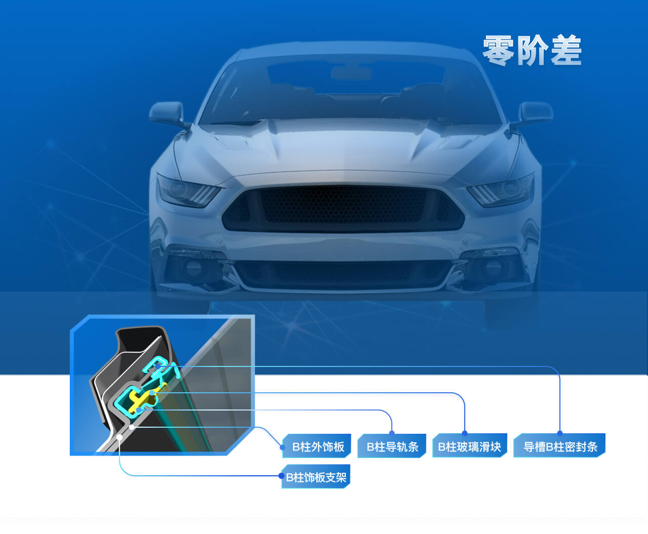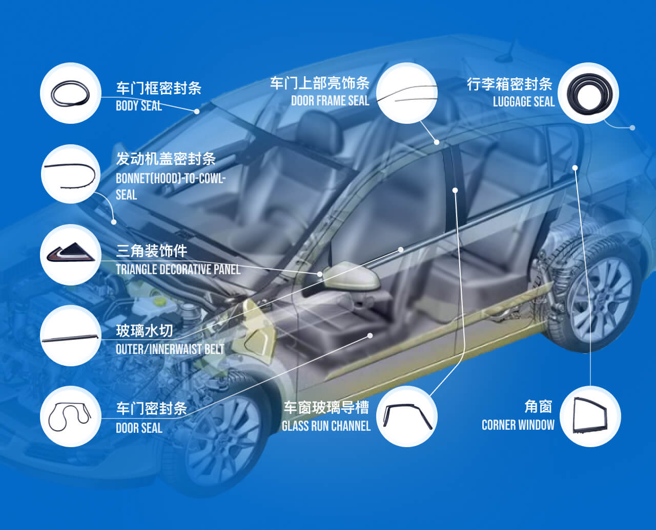 应用于汽车前后风挡、车门、车窗、发起机舱、后备箱等车身部位,填补车身部件之间的间隙,具有减震、防水、防尘、隔音、装饰等作用。